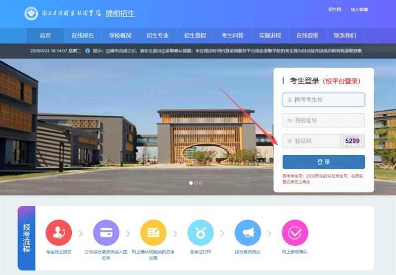 1.考生登录我校提前招生网(https://tqzs.zjjs.edu.cn),在考生登录页面中输入高考考生号、身份证号、验证码,点击“登录”。