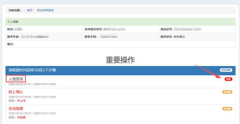 2. 点击“入围查询”可查看本人入围分和入围情况。