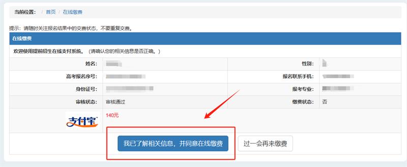 2.点击“我已了解相关信息,并同意在线缴费”后,进行支付宝扫码缴费。