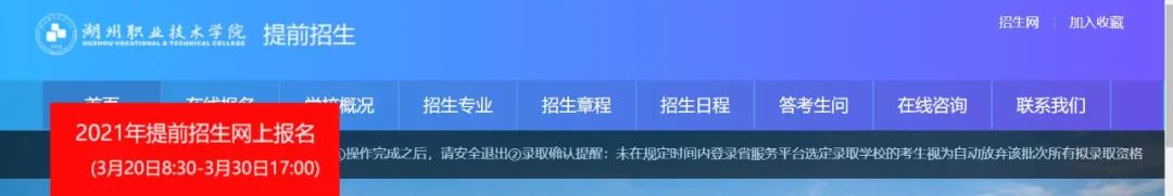 第二步:鼠标点击“湖州职业技术学院2021年提前招生专题网站”图标,进入我校提前招生专题网站报名系统。